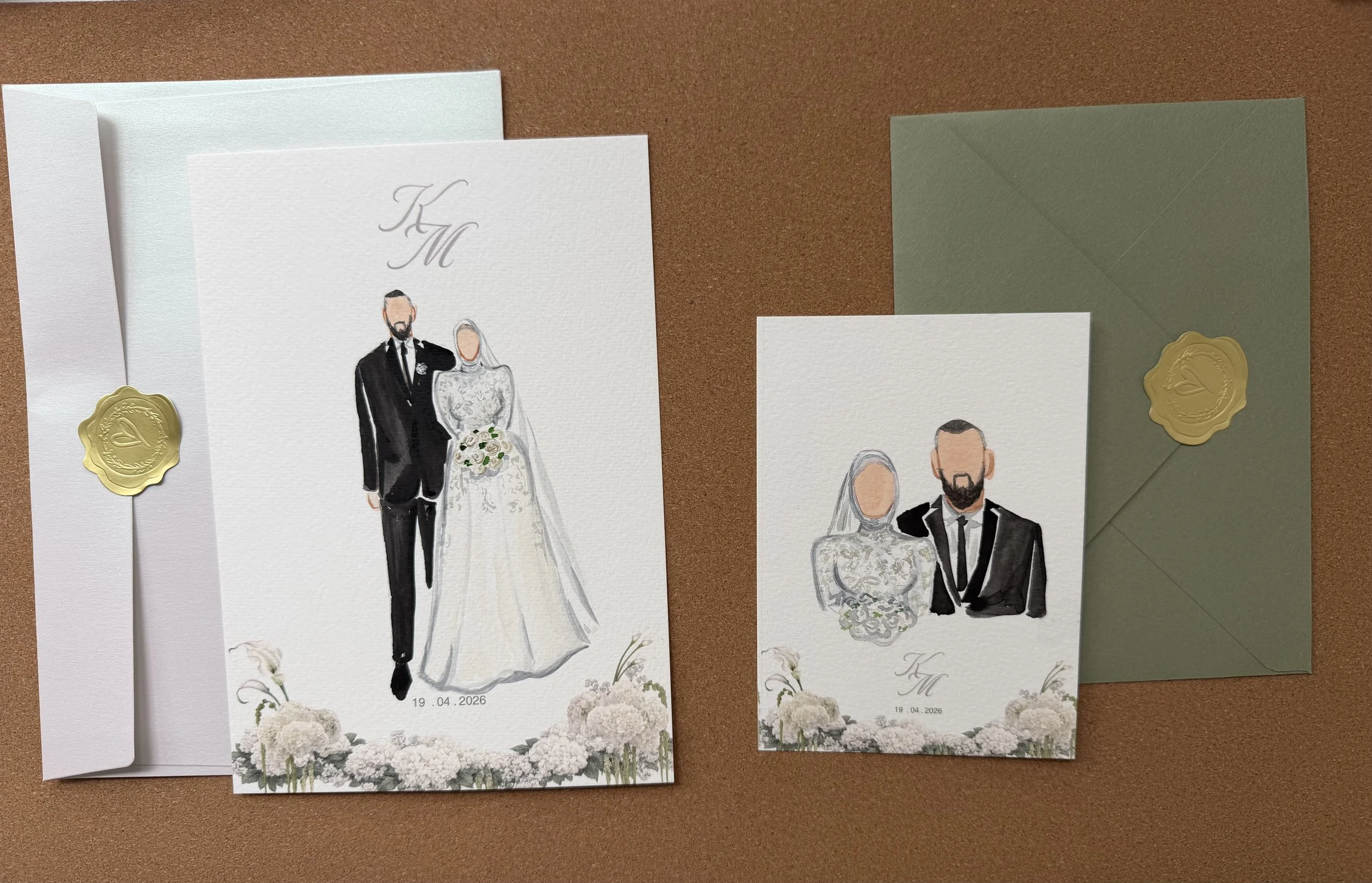 For me, the couple’s painting is always one of the most sentimental pieces. It becomes more than just an illustration — it becomes a memory of the day, the outfits, the emotion, and the beginning of their marriage.